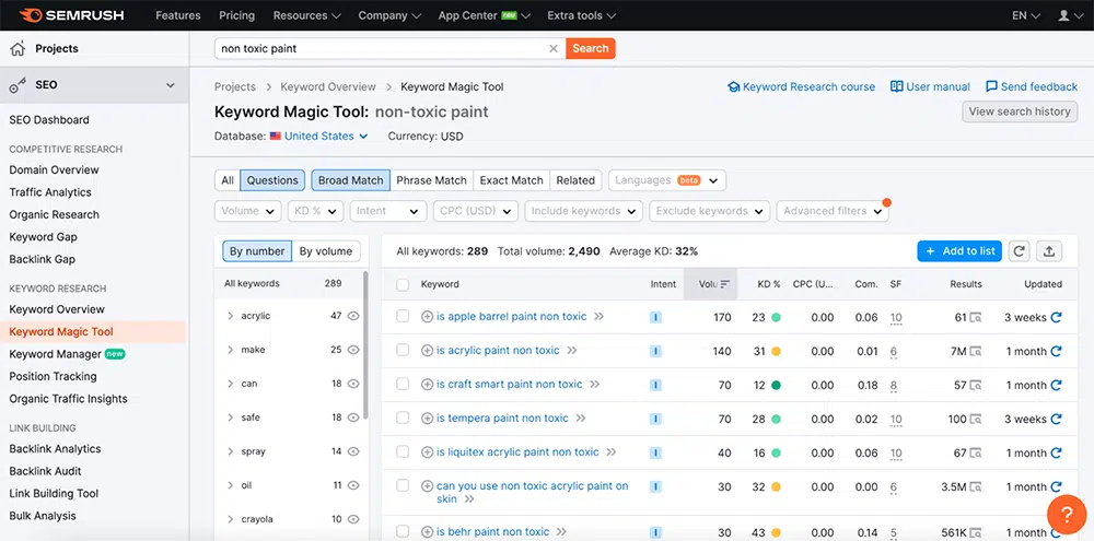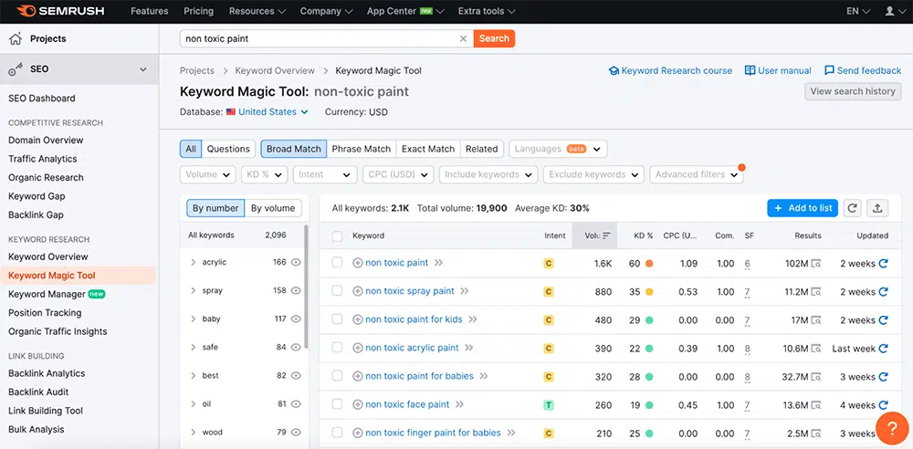 If we look at the Keyword Magic Tool, “non toxic paint” is actually a commercial search, and a number of other related keyword options are also commercial and transactional.
