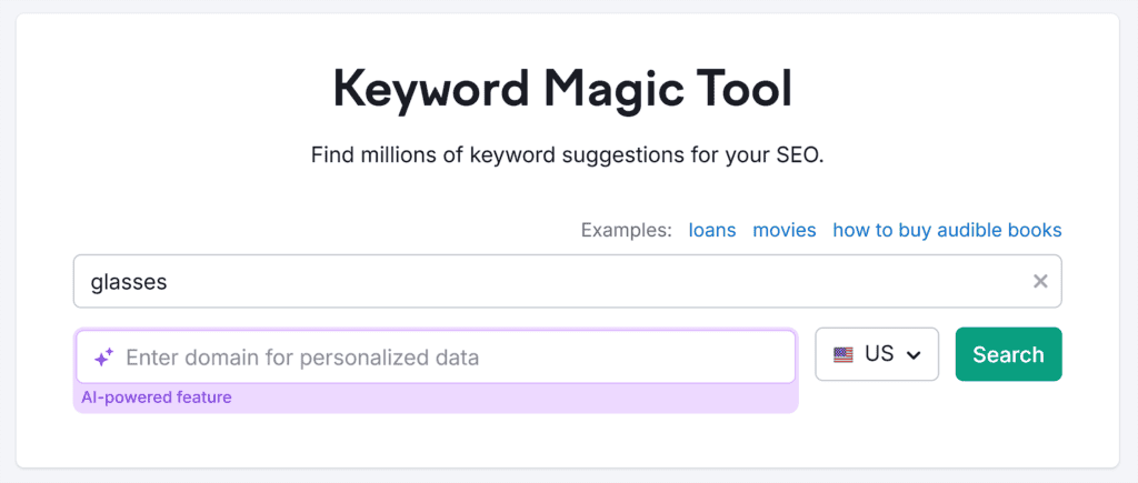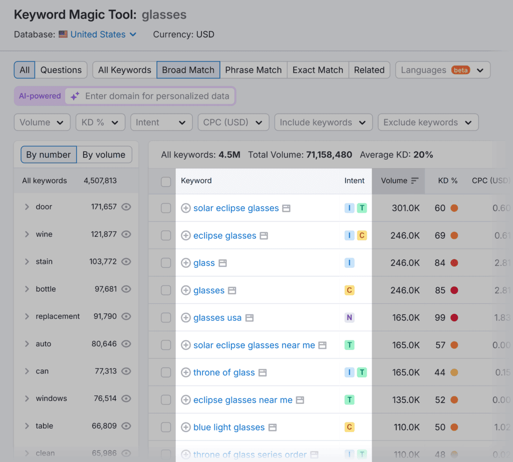 You can find keywords and analyze their intent with a tool like Semrush’s Keyword Magic.