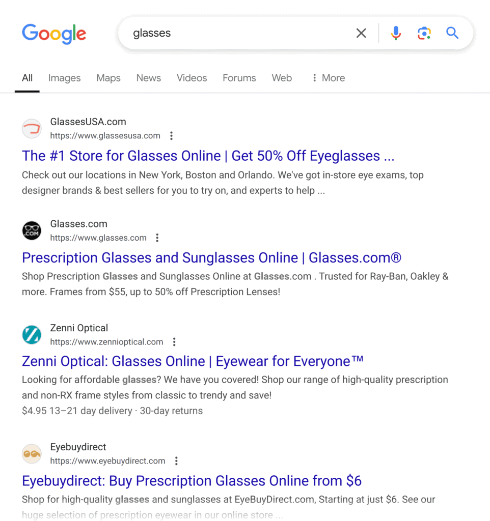For example, the SERP for “glasses” suggests that searchers want to buy eyeglasses: