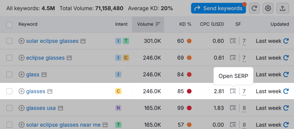 To learn more about search intent, click the “View SERP” icon in the “SF” column.