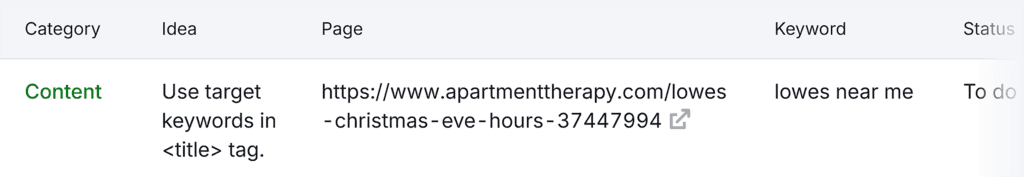 It’s a good idea to review your title tags periodically to ensure they’re high quality and follow best practices. Use a tool like Semrush’s On Page SEO Checker for this task.