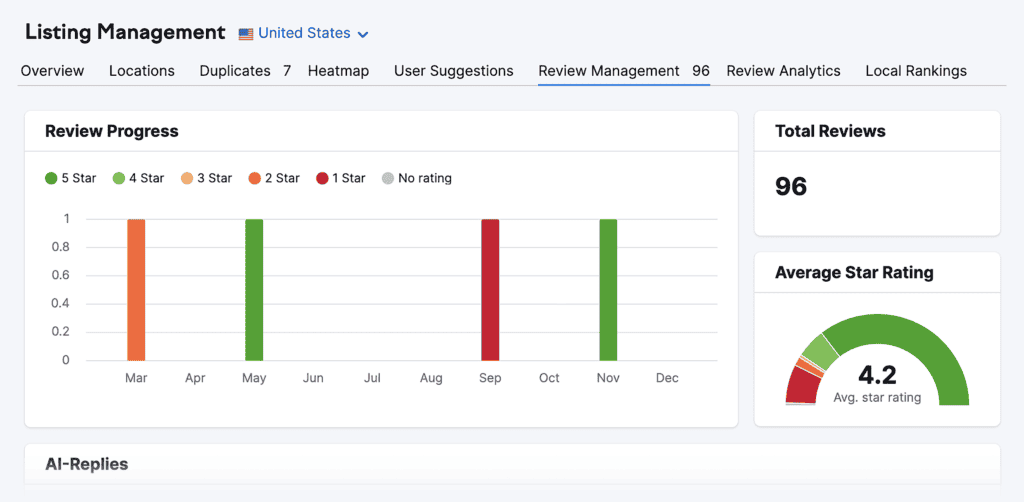 If you have a local business, managing online reviews is crucial for building trust with potential customers and improving your local SEO. Semrush’s Review Management tool helps you keep track of your online reviews and even lets you respond to Google reviews using AI.