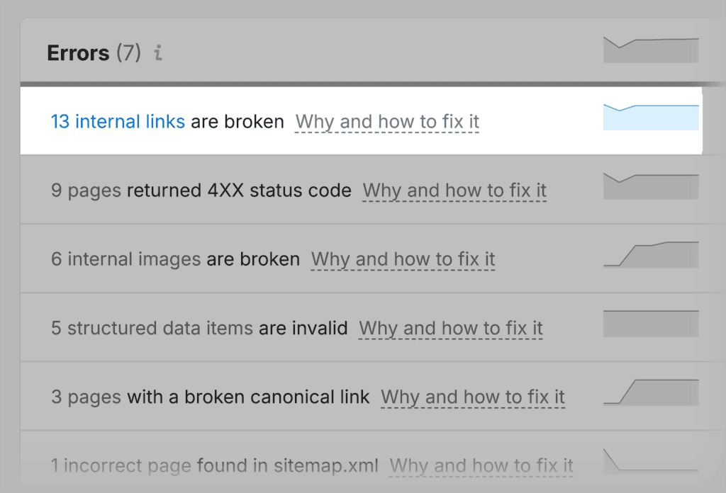 Run a site audit to review and optimize your internal links. A tool like Semrush’s Site Audit can help you with this task.