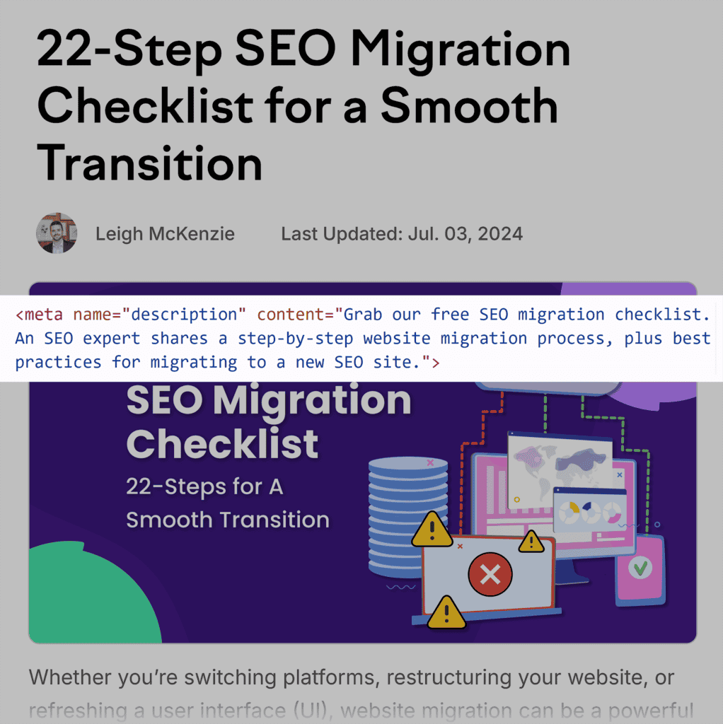 A meta description is a piece of HTML code that’s used to provide a summary of the webpage.