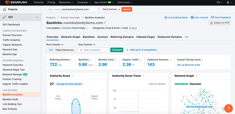 Backlink audit tools, like the one in Semrush, can be helpful not only in assessing the number of links you’ve attracted, but also their quality — which can help you spot potentially toxic links.