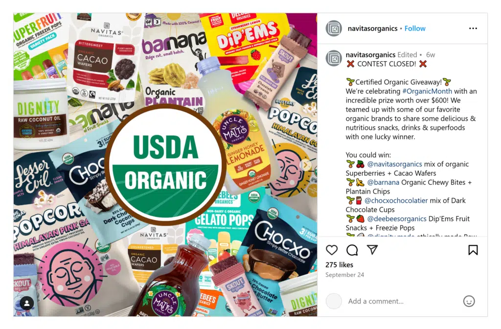 Users need to follow both accounts, tag two friends, and like and comment on the post to enter. This helps generate buzz for the giveaway and helps each brand grow its following.