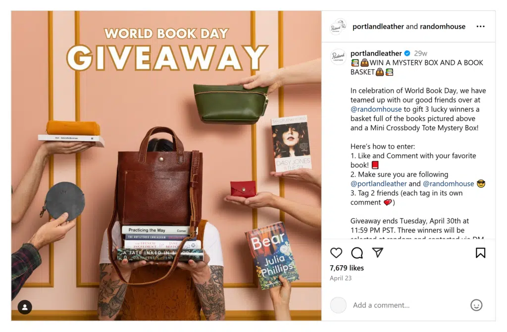 Here, you can see how Portland Leather partnered with Random House for a book and bag giveaway.