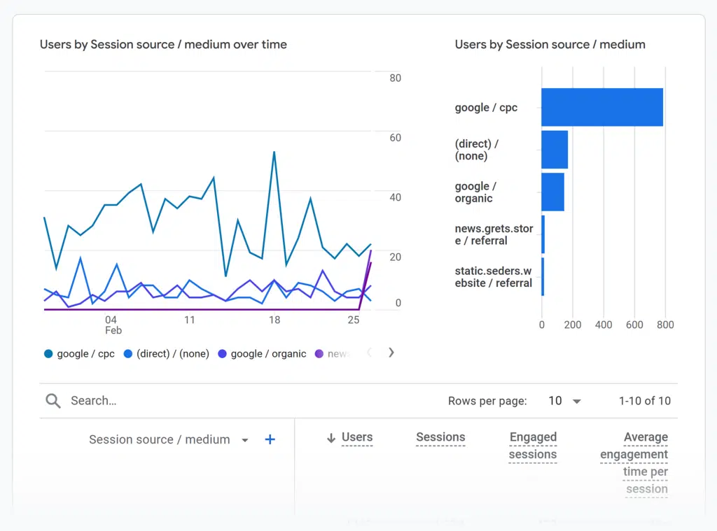 The “Traffic Acquisition” report reveals your traffic sources and shows your audience’s engagement time per session.