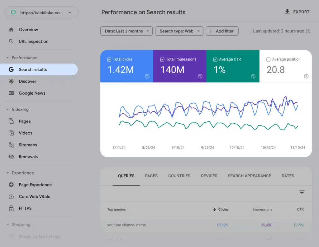 This report shows how many clicks your website received from organic search results in a specific time frame. It also displays total impressions, average click-through rate, and your site’s average position in search results.
