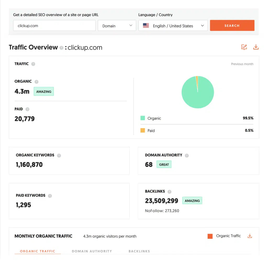 This includes an organic versus paid traffic breakdown, Domain Authority score, and backlink profile overview.