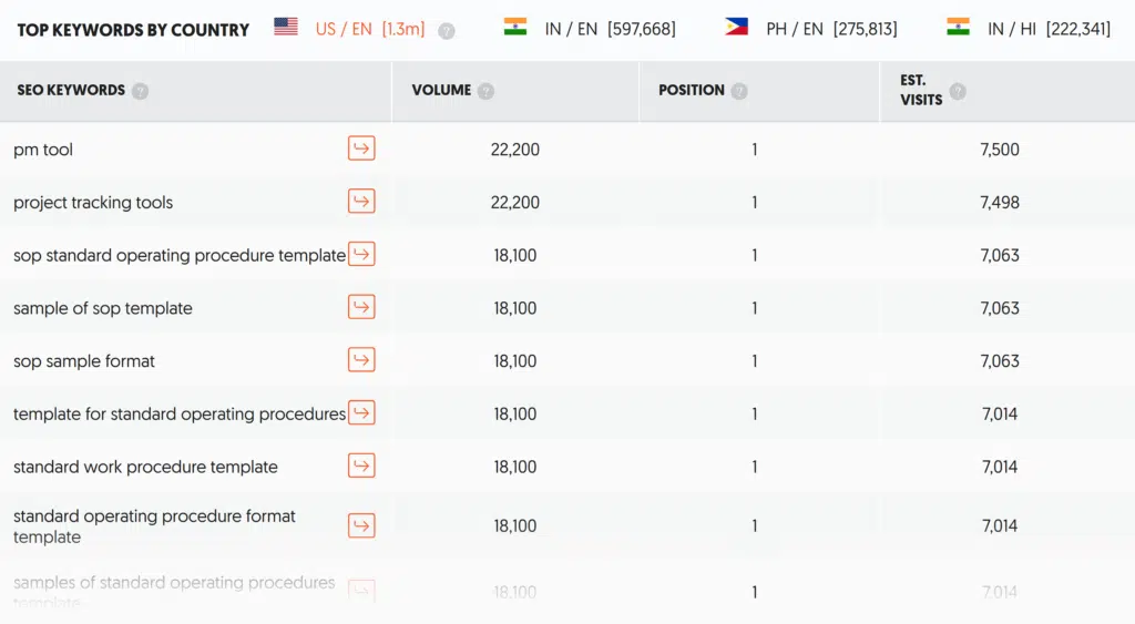 In the “SEO Keywords” report, you’ll learn which terms perform the best for any site, including estimated monthly volume, position, and visits.