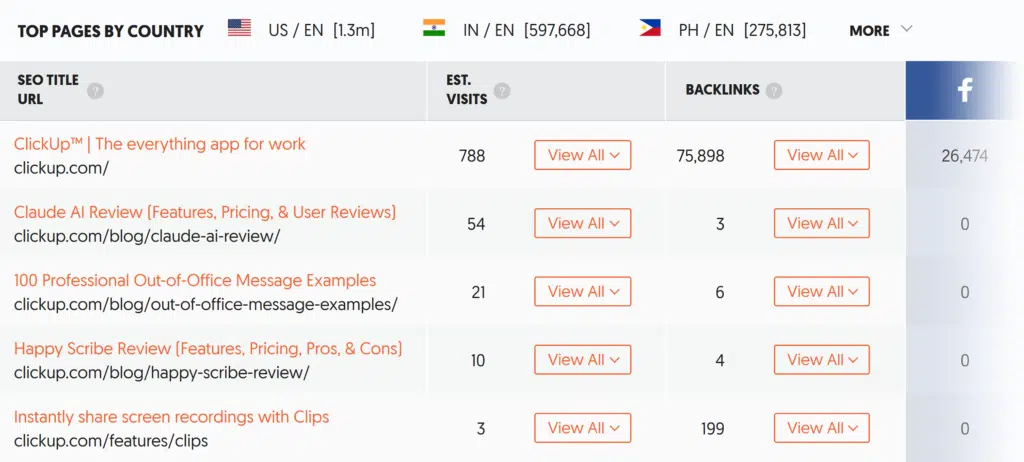 The “Top SEO Pages” report shows you what content performs the best, broken down by country, estimated visits, backlinks, and social shares.