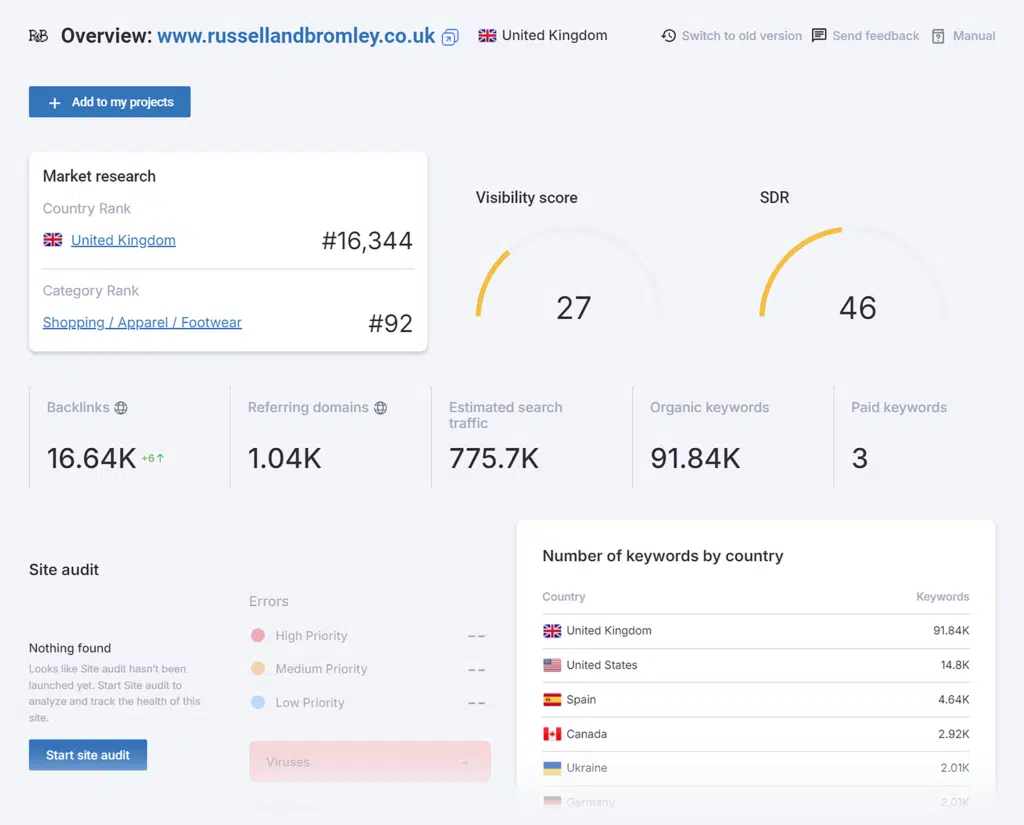 - Site Analysis tool: Enter any domain’s URL for an overview of total monthly traffic, visibility in the top 20 search results, ranking keywords, and more
