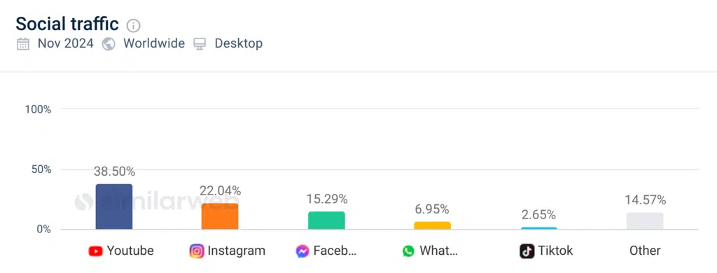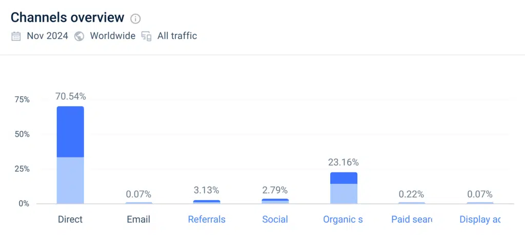 For example, if you notice a competitor getting 30% of their traffic from email marketing while you’re only at 5%, this could signal an opportunity to expand your strategy.
