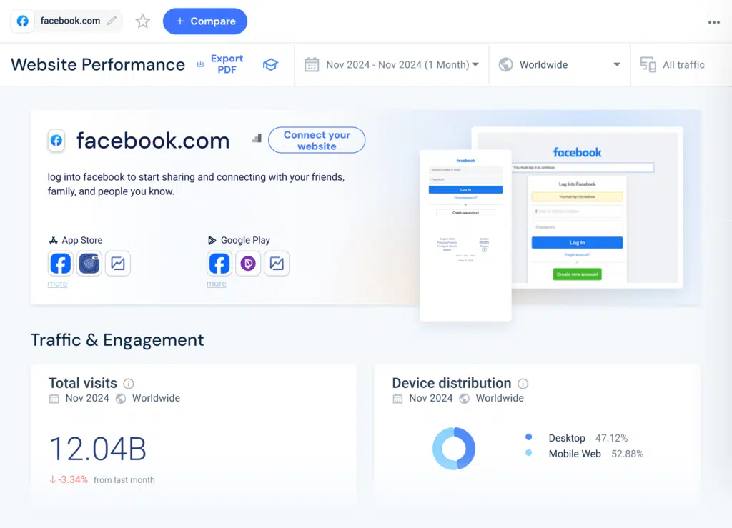 - Global website traffic rankings: Compare how different sites perform across countries and industries, with detailed market share data and engagement metrics for each region