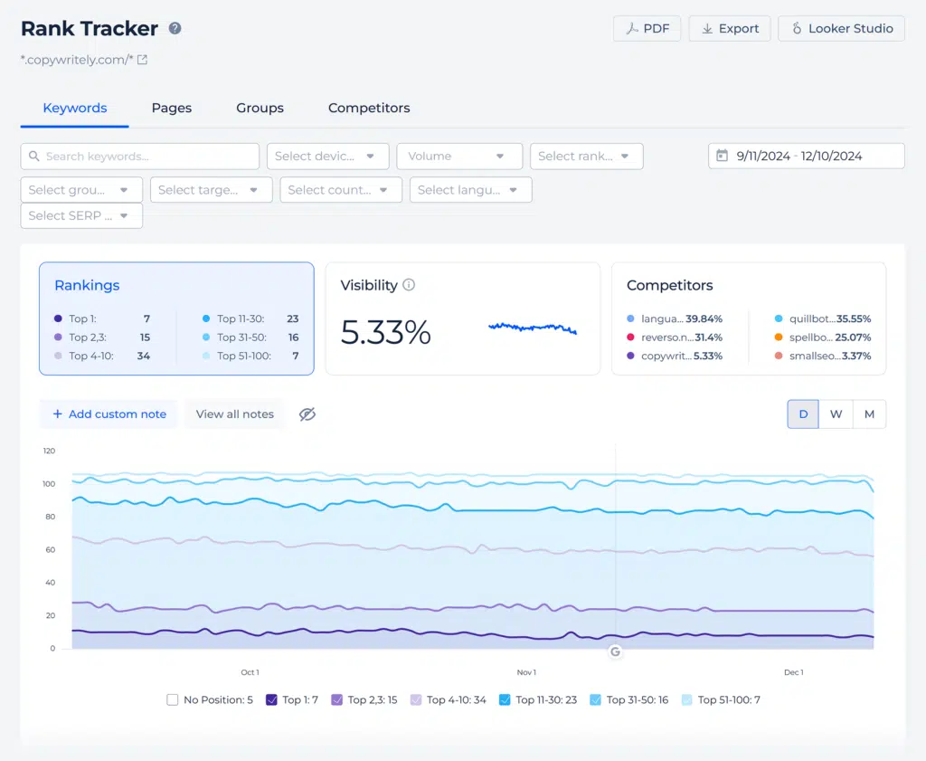 Want to know how your competitors stack up? Many competitor monitoring tools let you analyze any site to learn their top-ranking keywords, most popular pages, top traffic sources, content gaps, and more.