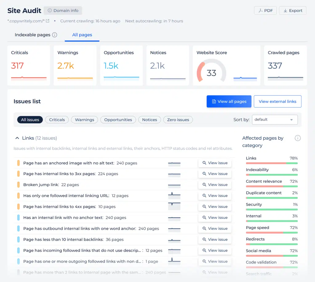- Technical SEO monitoring: Get alerts about technical issues that could hurt your rankings, from mobile problems to speed issues