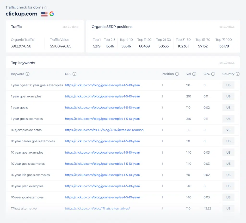You’ll see a report that tells you how much organic traffic the site gets, organic SERP positions, and top keywords.