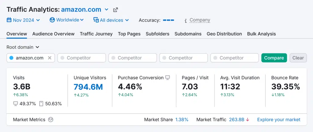In the “Overview” report, you’ll get instant insights into your competitors’ web traffic, including visits per month, purchase conversion, bounce rate, and market share.