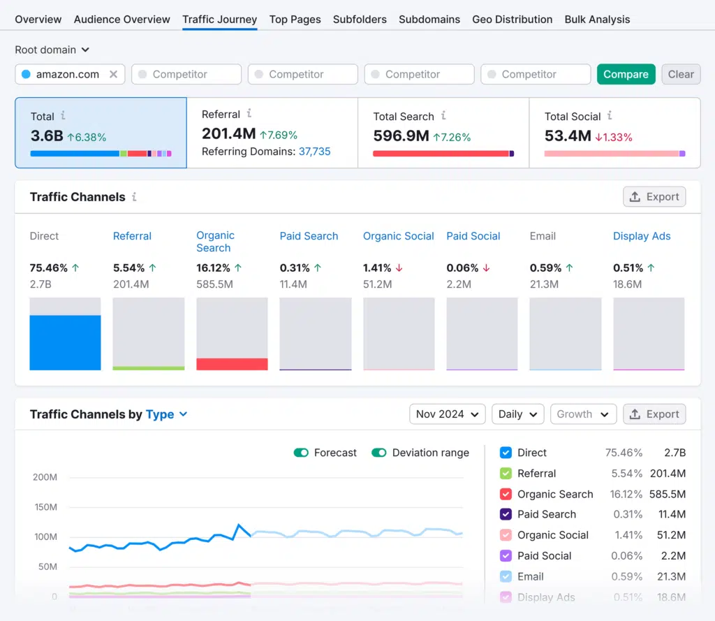 - Traffic Journey report: Discover every traffic source your competitors use, from their top-performing social channels to top referring domains and search rankings