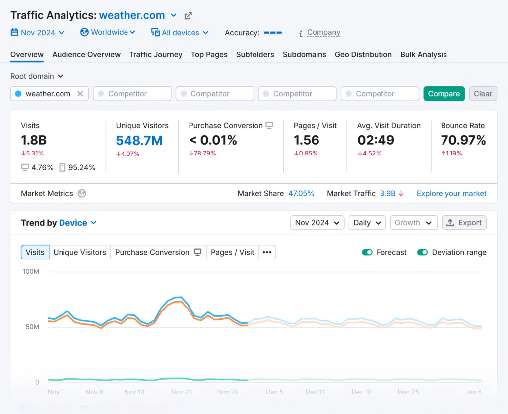 Website analysis isn’t just about understanding your own site—it’s also about gaining insights into your competitors. Semrush’s Traffic Analytics is a powerful and easy-to-use tool that gives you the inside scoop into your rivals’ strategies.