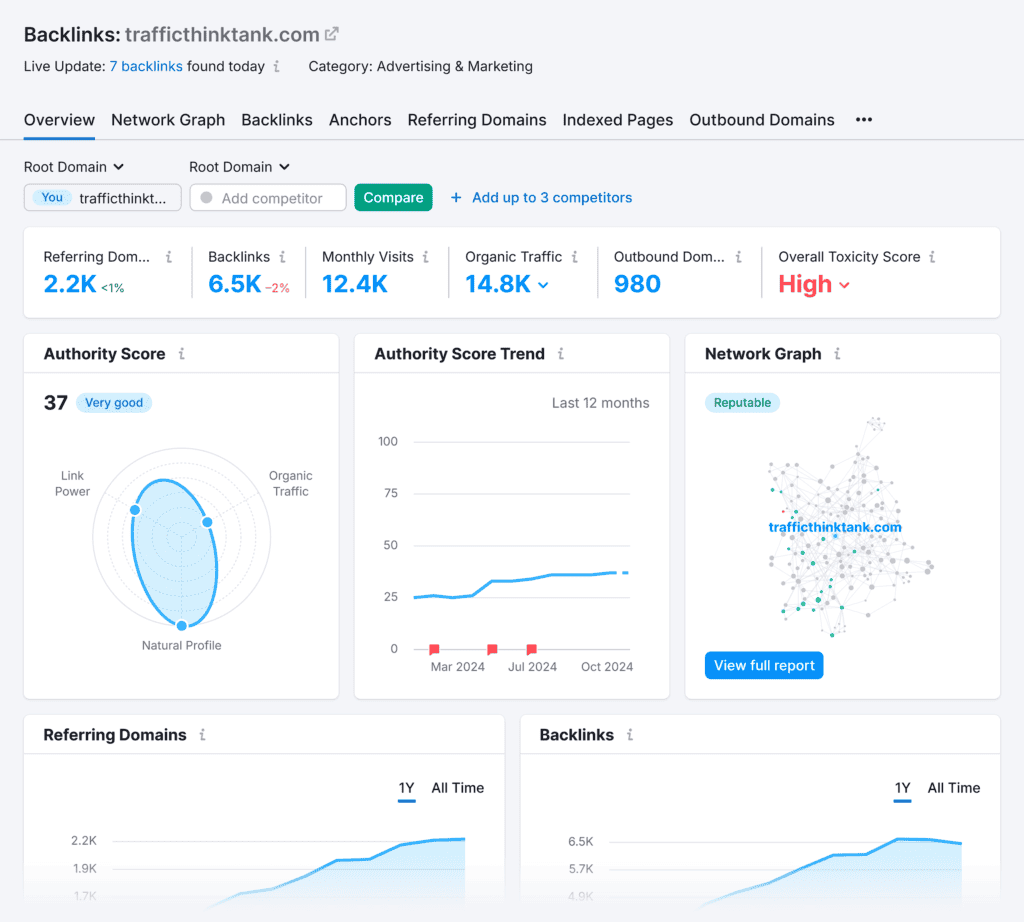 You can check any site or page’s backlink profile with Semrush’s Backlink Analytics tool.