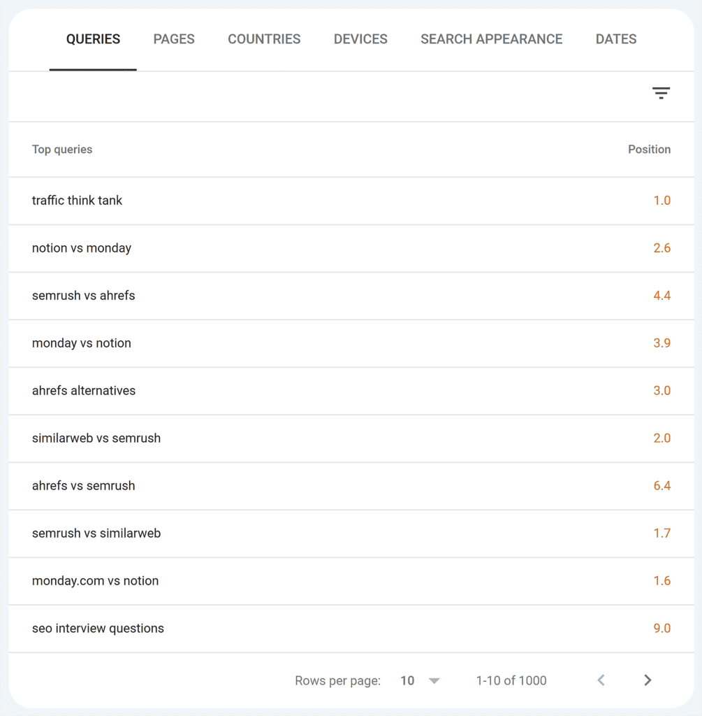 And if you scroll down to the “Queries” report, you’ll be able to see your average ranking position for all the search terms that drive organic clicks to your site.