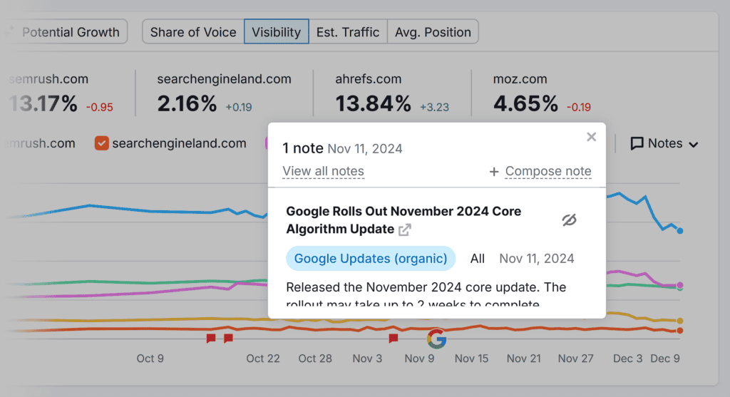 Some keyword rank tracking tools will highlight Google updates for you. This way, you can look back at your rankings over time and identify whether ranking drops or gains correspond with a particular Google update.