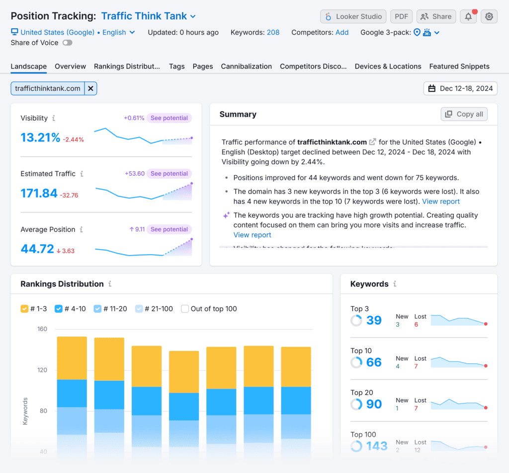 Just set up a project and enter the keywords you want to track. You’ll then see a “Landscape” report that tells you your: