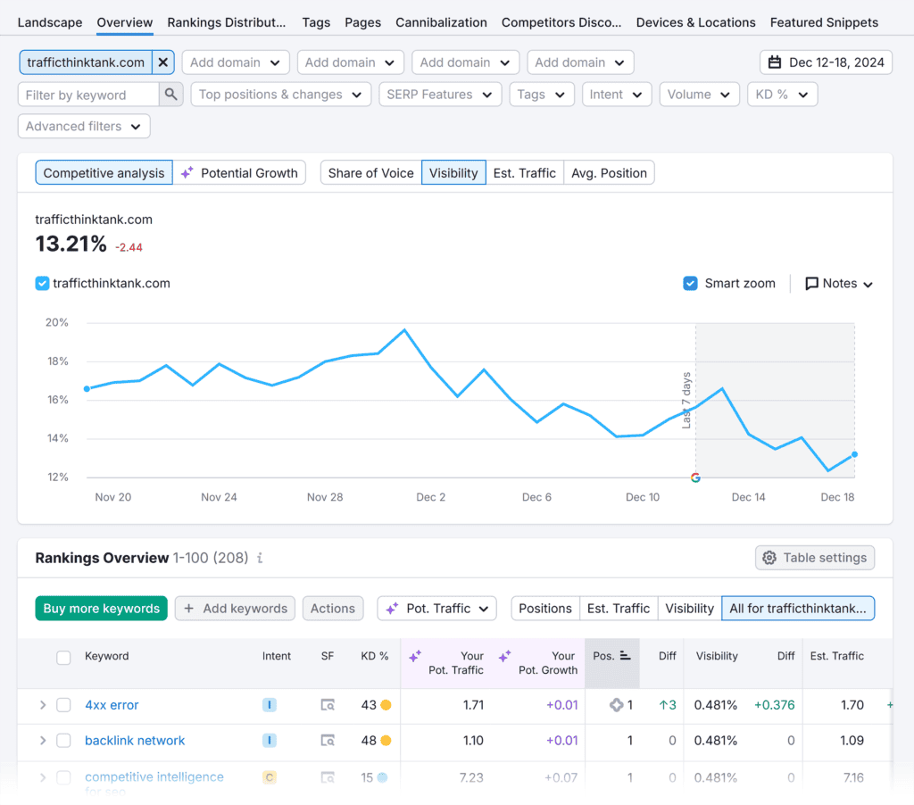 You can also see how your site’s share of voice, visibility, traffic, and average position (for specific keywords) compares to your competitors on the “Overview” tab.