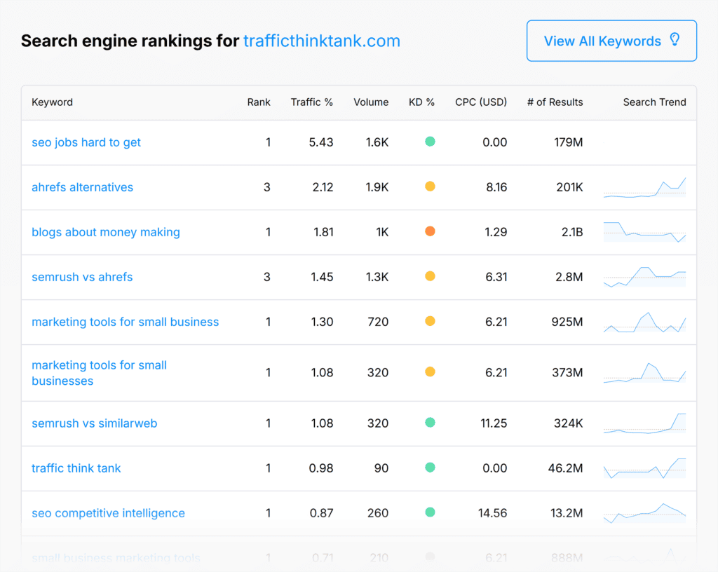 - Traffic %: The proportion of the site’s total traffic that keyword drives