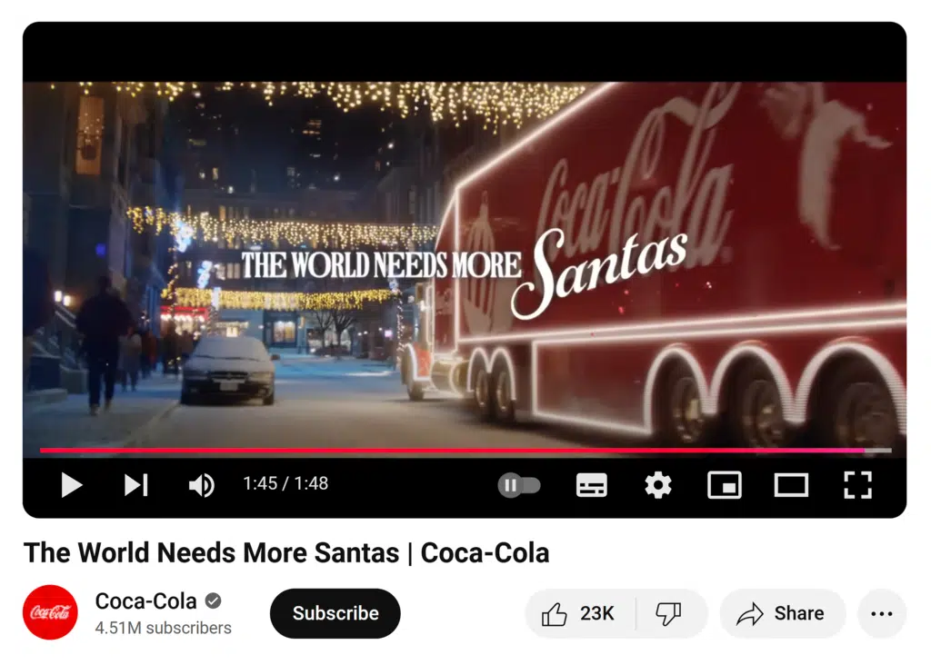 What they did: Coca-Cola’s 2023 campaign, “The World Needs More Santas,” centered on spreading joy and kindness. The campaign content encouraged consumers to channel their inner Santa Claus.