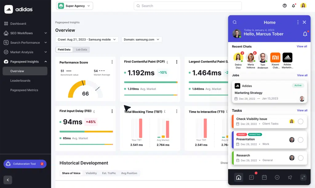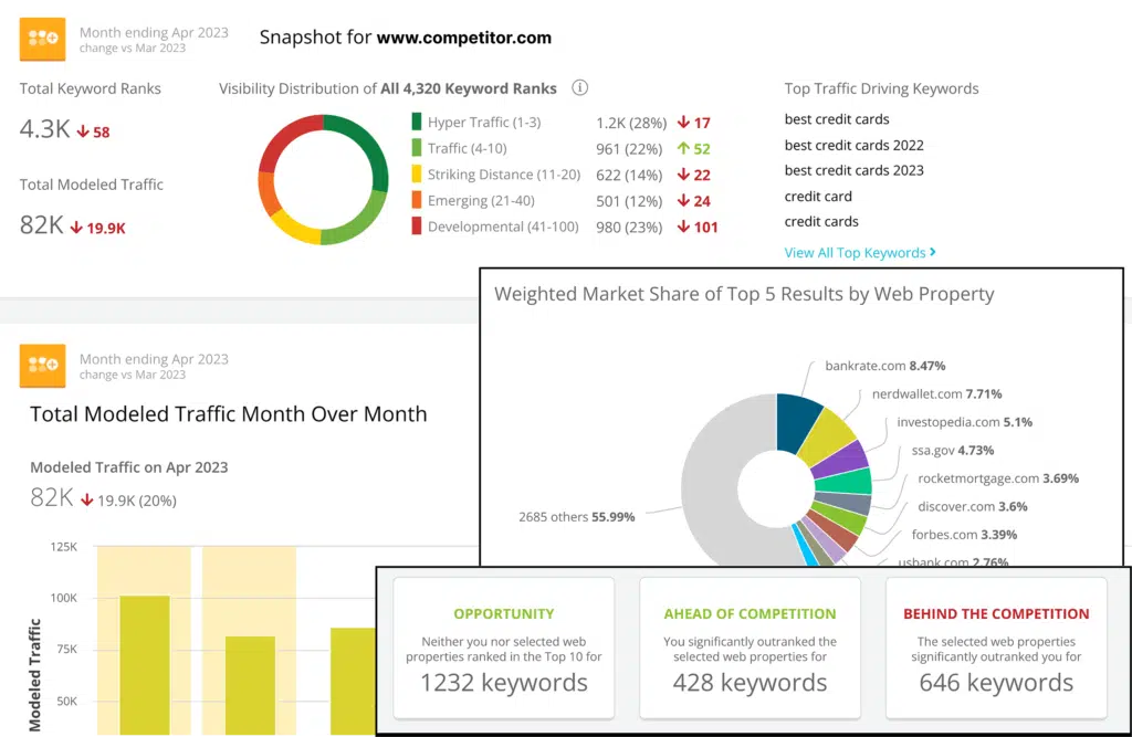 - Comprehensive market analysis: Keep tabs on your competitors and where you stand in your industry with powerful market analysis tools. Monitor your share of voice, relative market share, and more. All while getting important insights into your competitors’ performance.