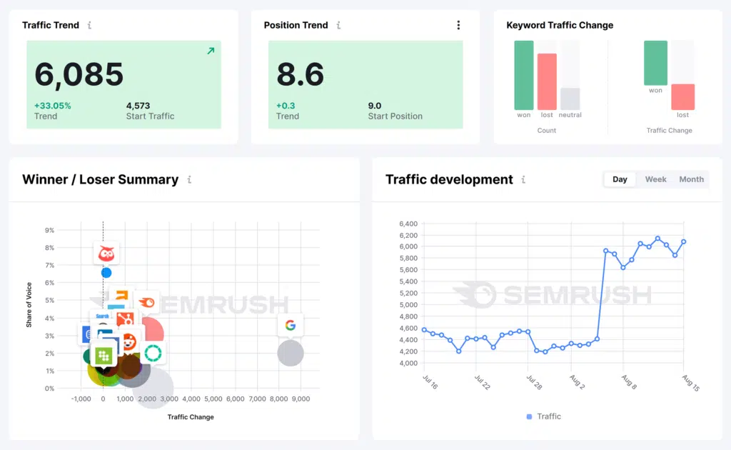 For example, when Google rolls out an algorithm update, Semrush’s automation tools can quickly show how it affects your websites. The platform analyzes traffic patterns across your domains. Identifying potential issues and opportunities.