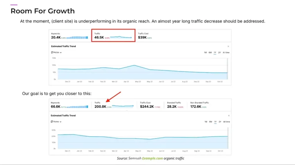 Here’s how you can elevate your SEO proposal by showing the transformative power of your work. It’s a wise move that explains the value of your efforts better than any words.