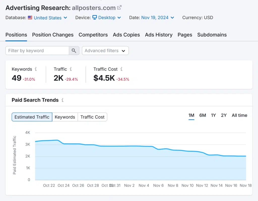 We can use Semrush’s Advertising Research tool to find which keywords a competitor bids on, along with any live ads they’re currently running. You can even see whether or not the campaigns are going well.