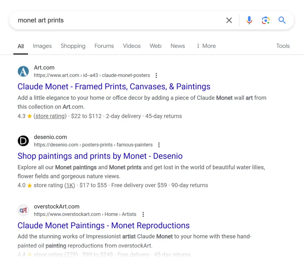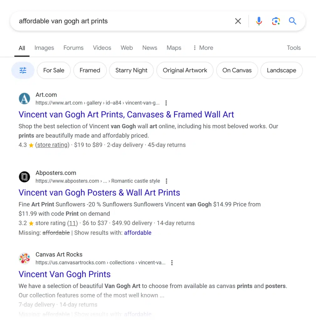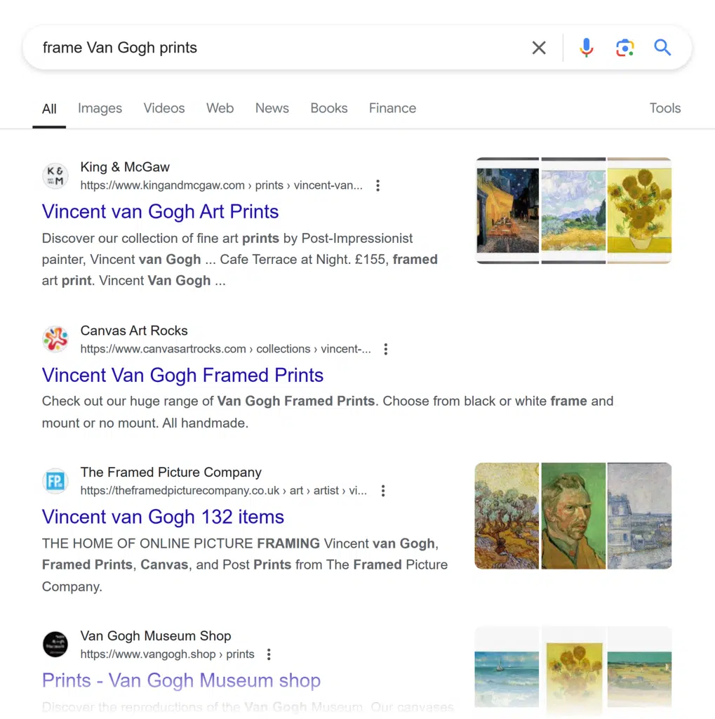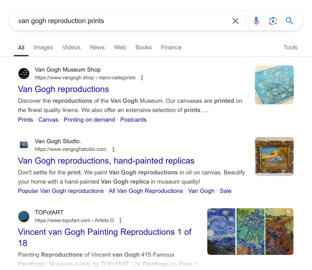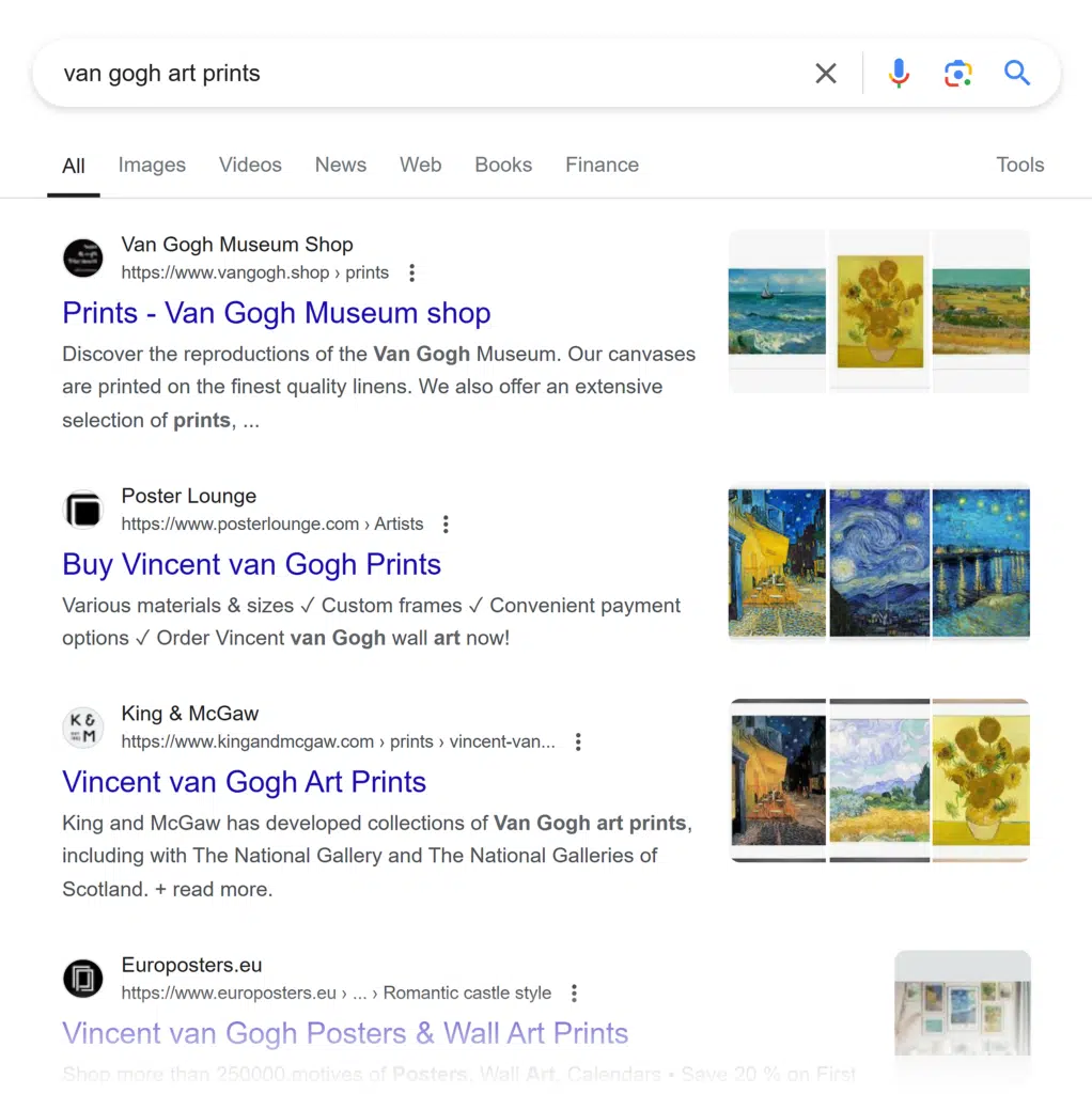 For example, as you can see in the screenshot above, sites like Van Gogh Museum Shop and King & McGaw have the top placements in search.