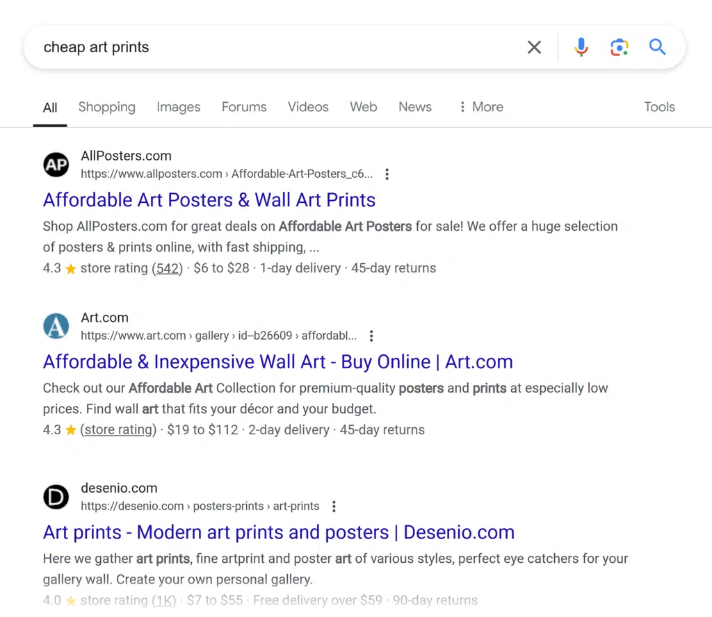 For example, if your website is desenio.com, a Google search for “van gogh art prints” reveals which sites have the top spots for this term.