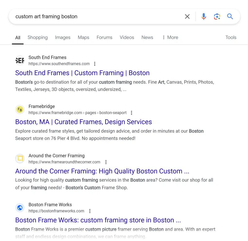 This is especially powerful when competing against individual frame shops that only have basic location pages.