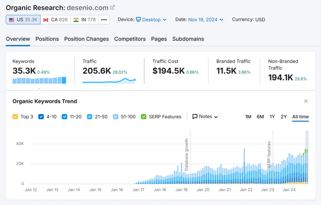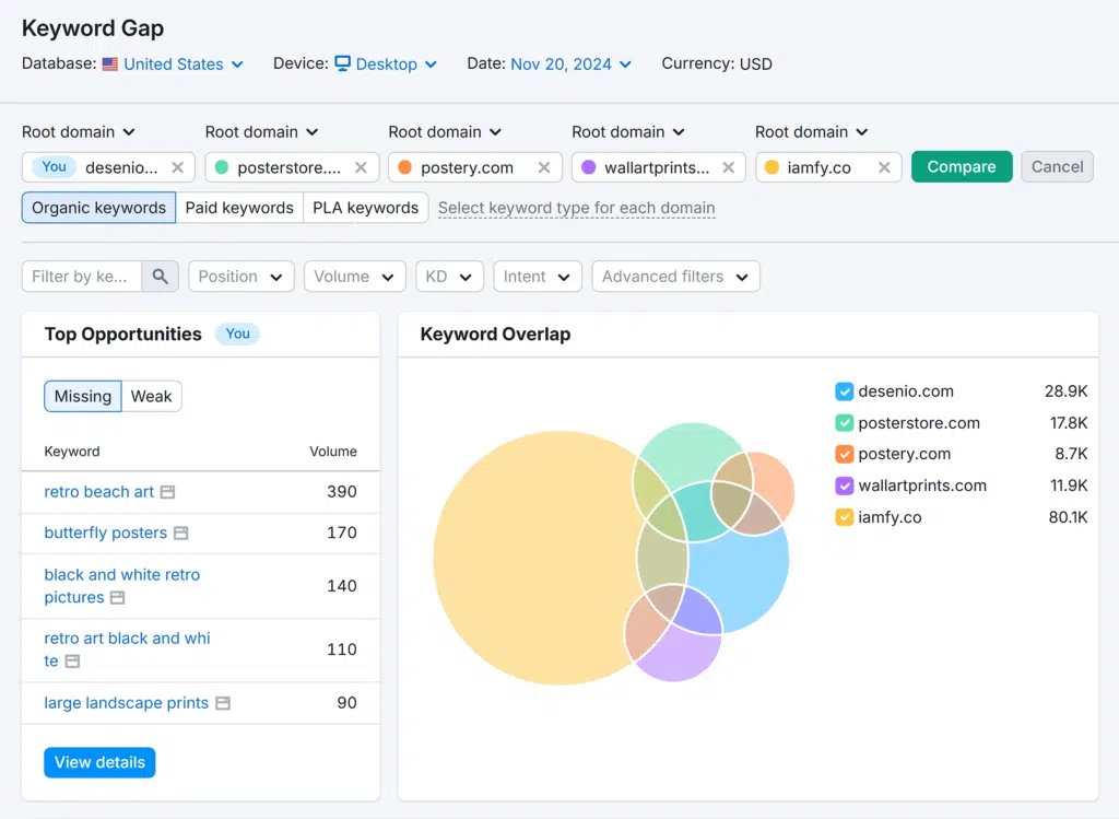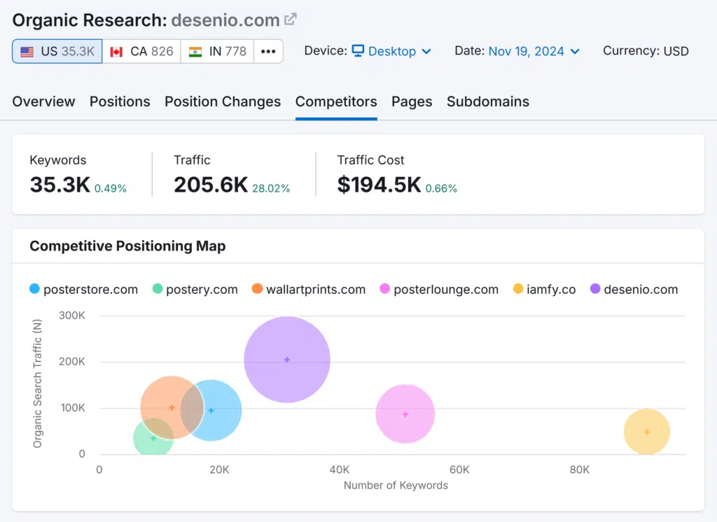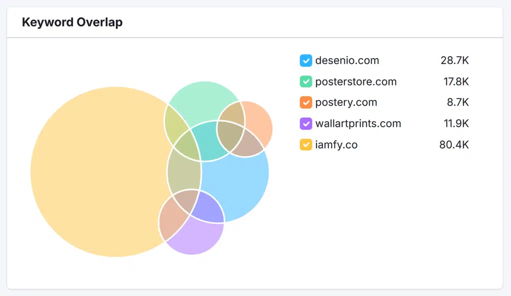 So, if you have a website like desenio.com that isn’t near the top 10 for your target Van Gogh terms yet, and you’re not quite sure who your biggest competitors are, SEO software can help. (And if you’re comparing Semrush vs. Similarweb, Semrush is the way to go when it comes to competitor research tools.)