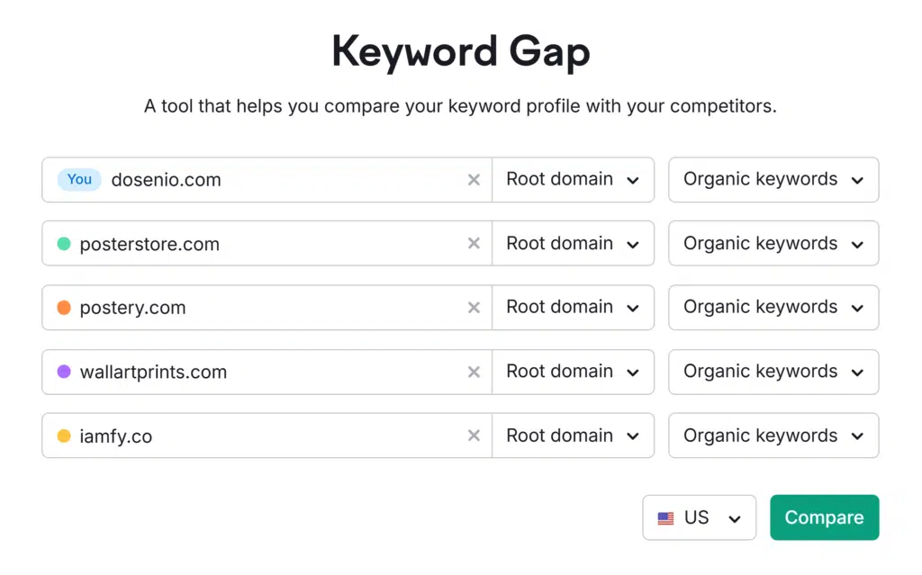 Add your competitors’ domains, and you’ll get a report detailing the keywords you share, as well as the ones your site lacks.