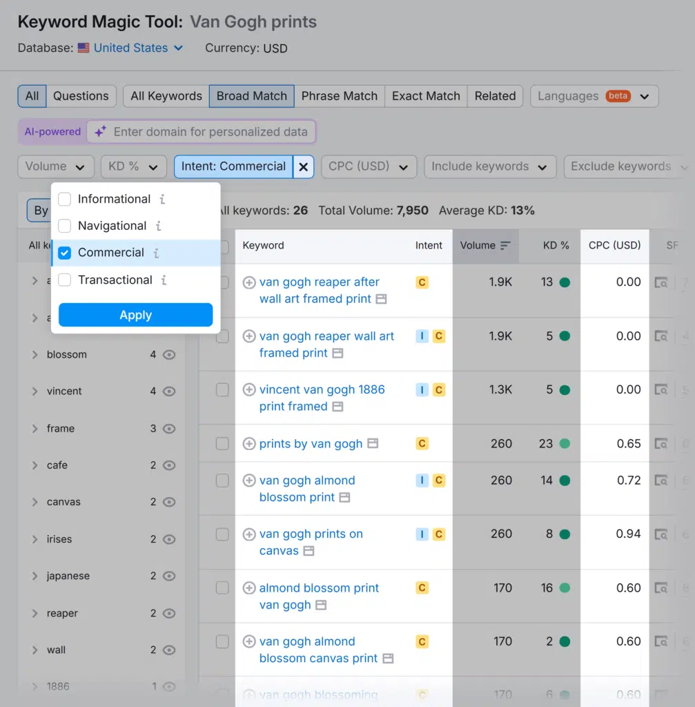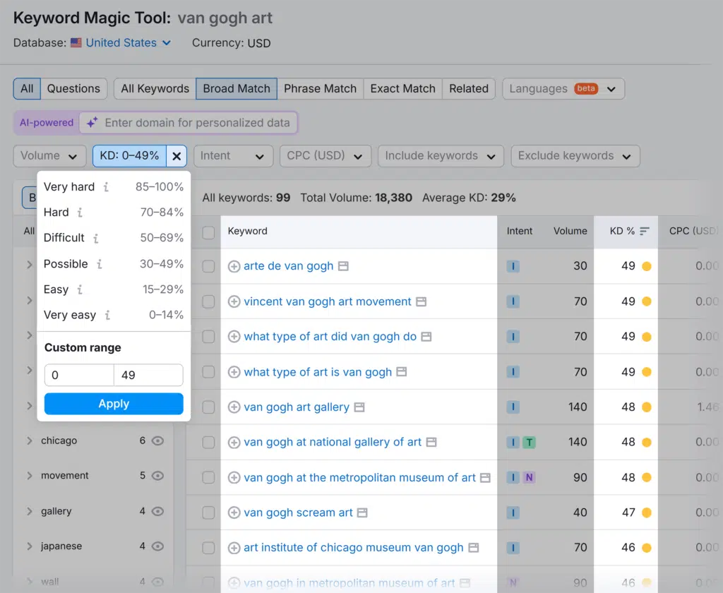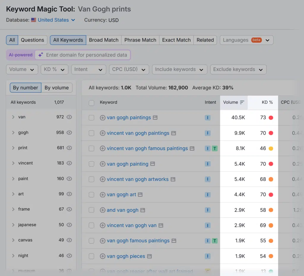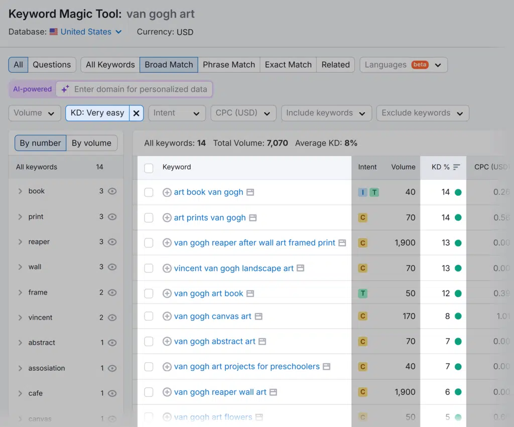 However, when you filter by keyword difficulty, you can discover long-tail keywords that are much easier to compete for, such as “van gogh abstract art” and “van gogh canvas art.”