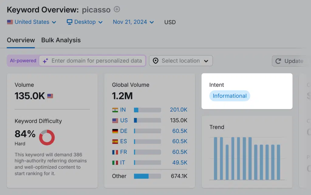 To determine the search intent for a keyword, use Semrush’s Keyword Overview tool.