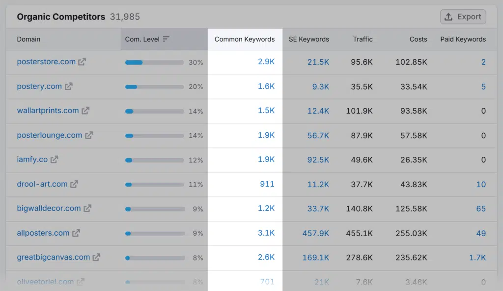 Examine each organic competitor to discover how much traffic they get, the keywords they have in common with your site, and their paid keywords.