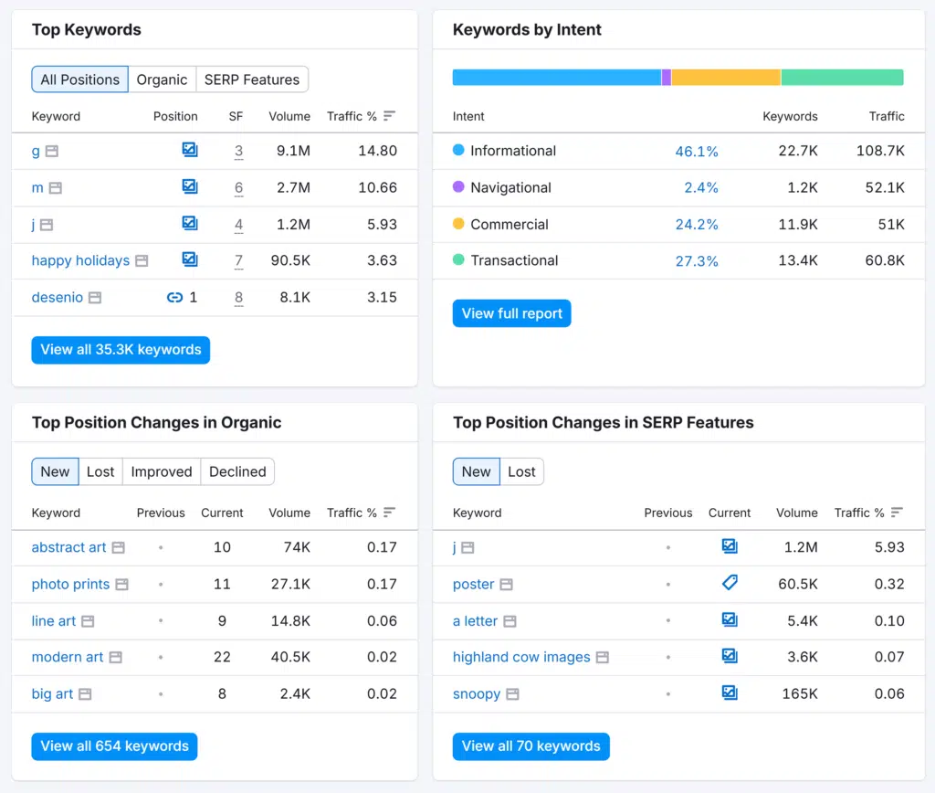 For instance, if a competitor who previously ranked #2 for “Monet art prints” slips to #6, it’s a chance to improve your content by targeting the same keyword and potentially outranking them.