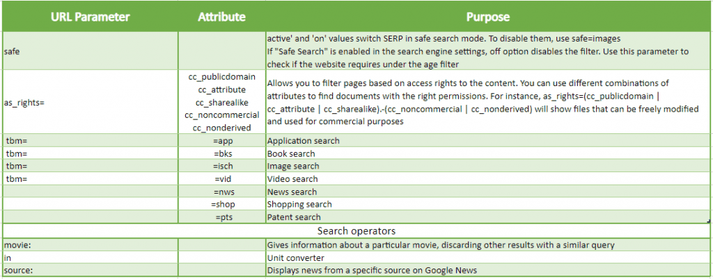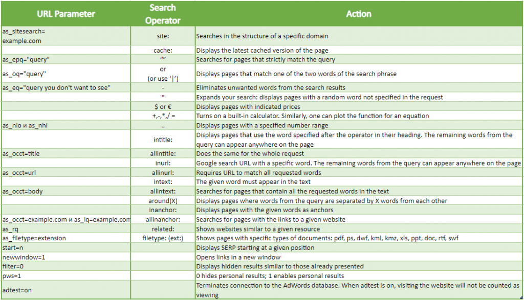 Google search parameters are a set of short and logical commands. They are easy to memorize—like a multiplication table—if you use them regularly. If you are facing an unusual task or are in doubt about the relevance of your search query, the tables below will come to the rescue. To get the most accurate results, combine several GET statements in a single query.