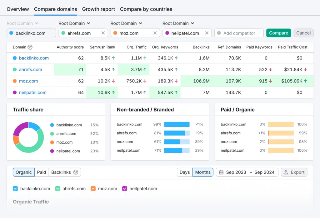 Researching competitors’ SEO strategies manually takes a lot of time. That’s why I prefer automating this mundane task with Semrush’s competitive research tools.
