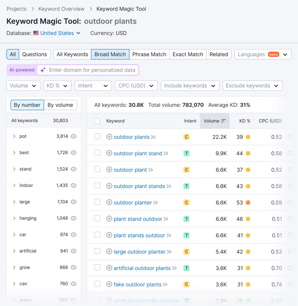Semrush’s Keyword Magic tool is great for finding long-tail phrases related to your main topic. No more clunky Excel spreadsheets for tracking and grouping keywords — you can organize your phrases into clusters with just a few clicks.