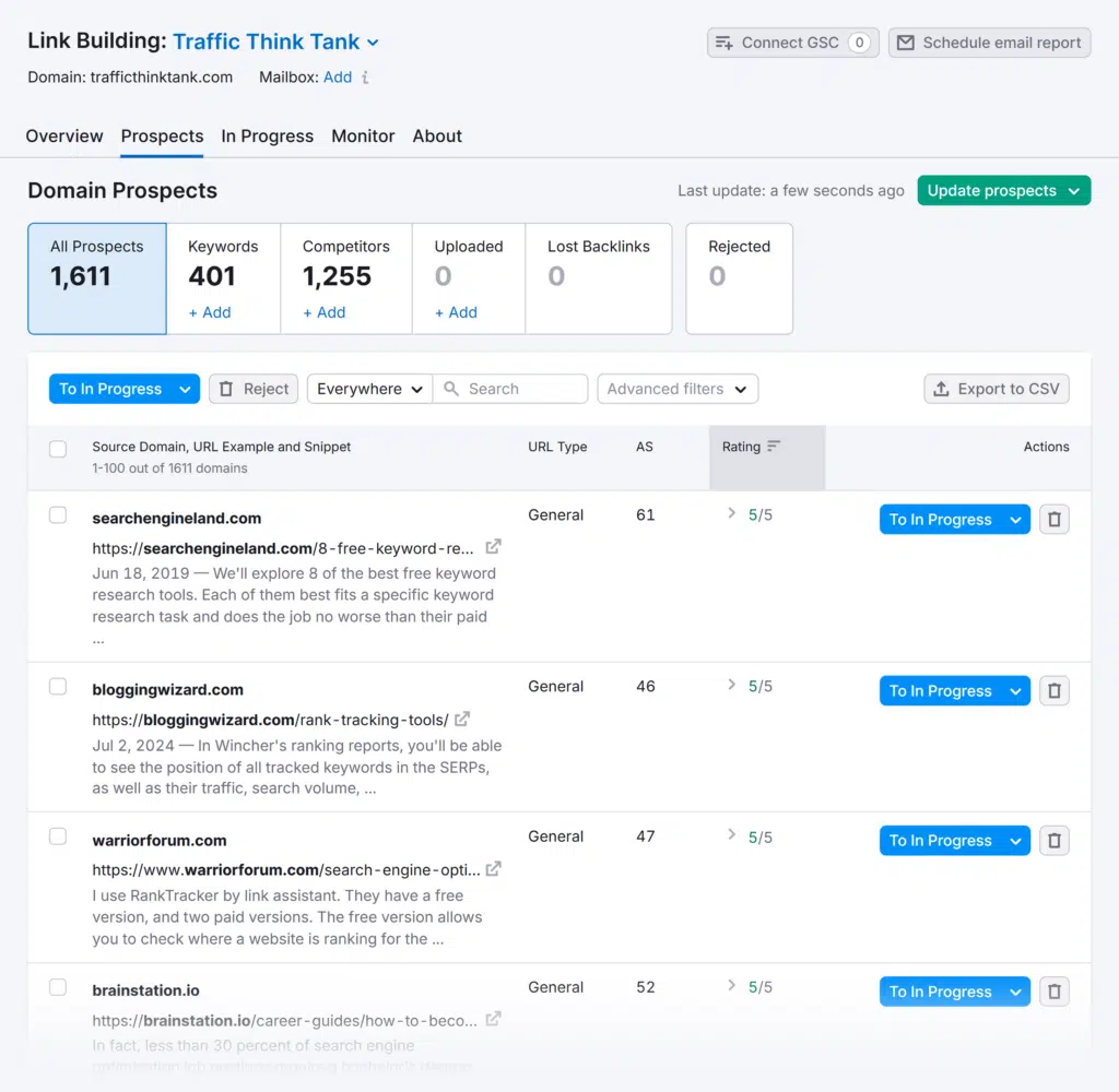 It automatically discovers backlink prospects for your website. You don’t have to spend hours researching and analyzing link-building opportunities. With Semrush, you can gather prospects’ contact information, reach out to them, and track your link-building progress.