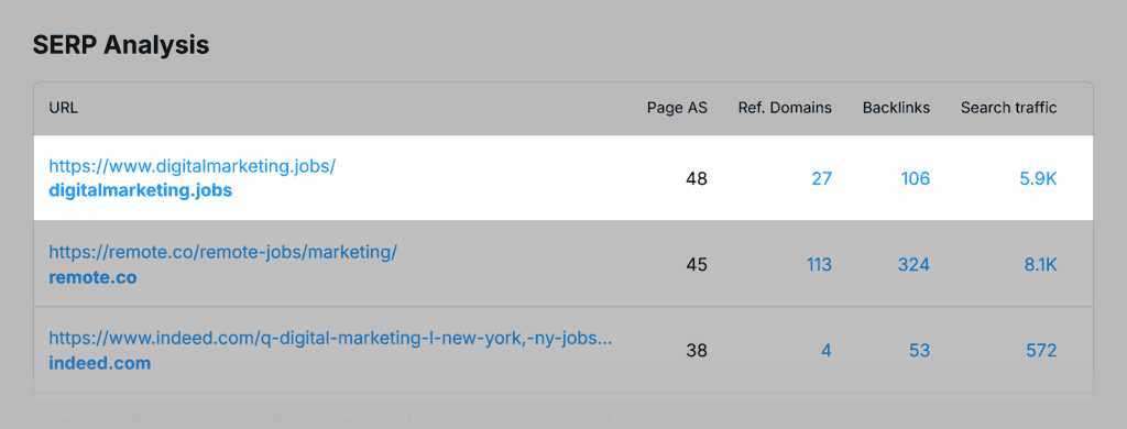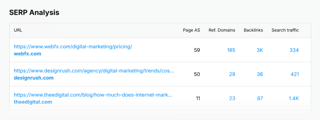 Comparing the domain authorities of your top rivals to your own during an SEO competitor analysis will give you a clear understanding of what’s possible for you in the SERPs.